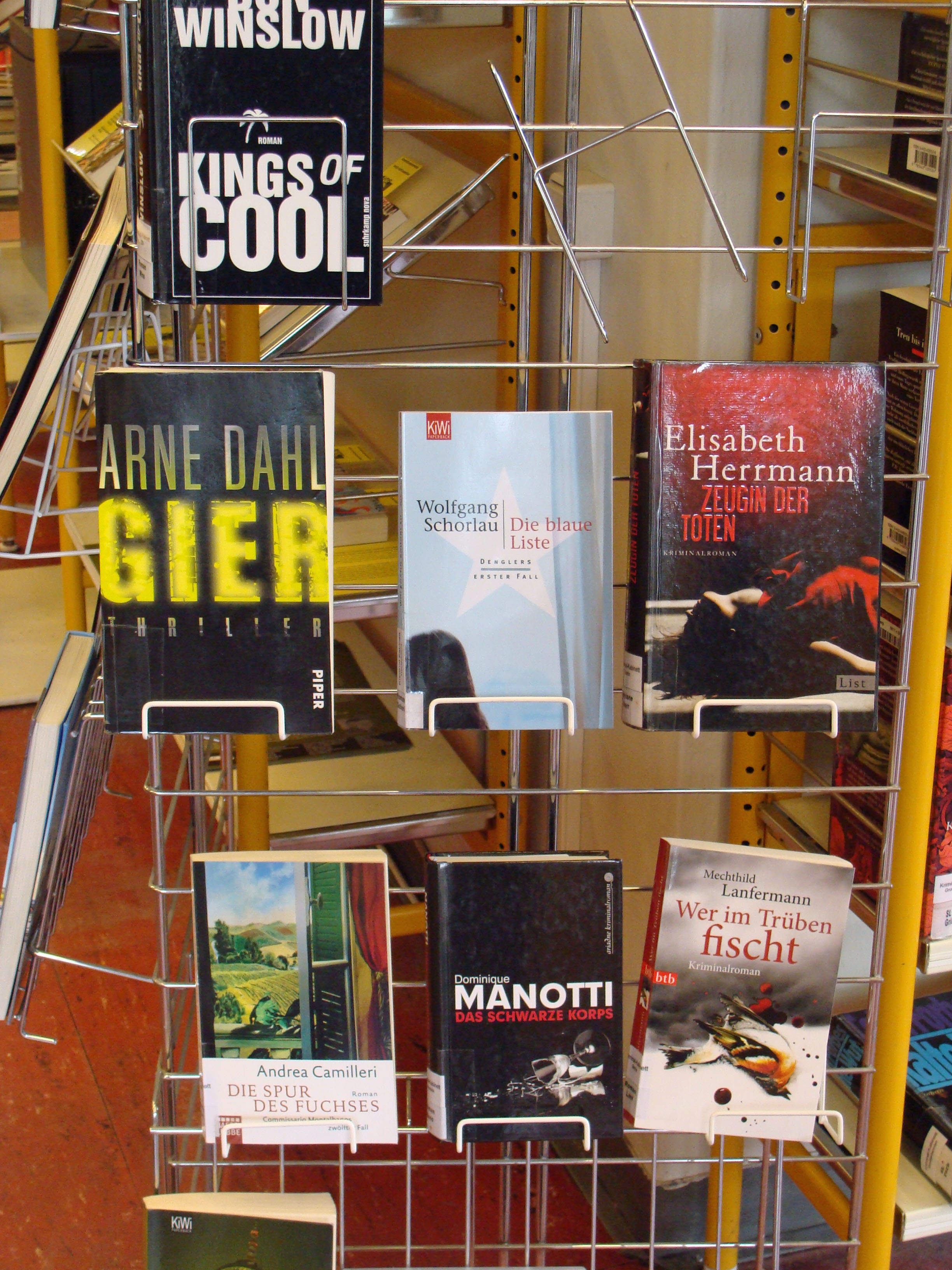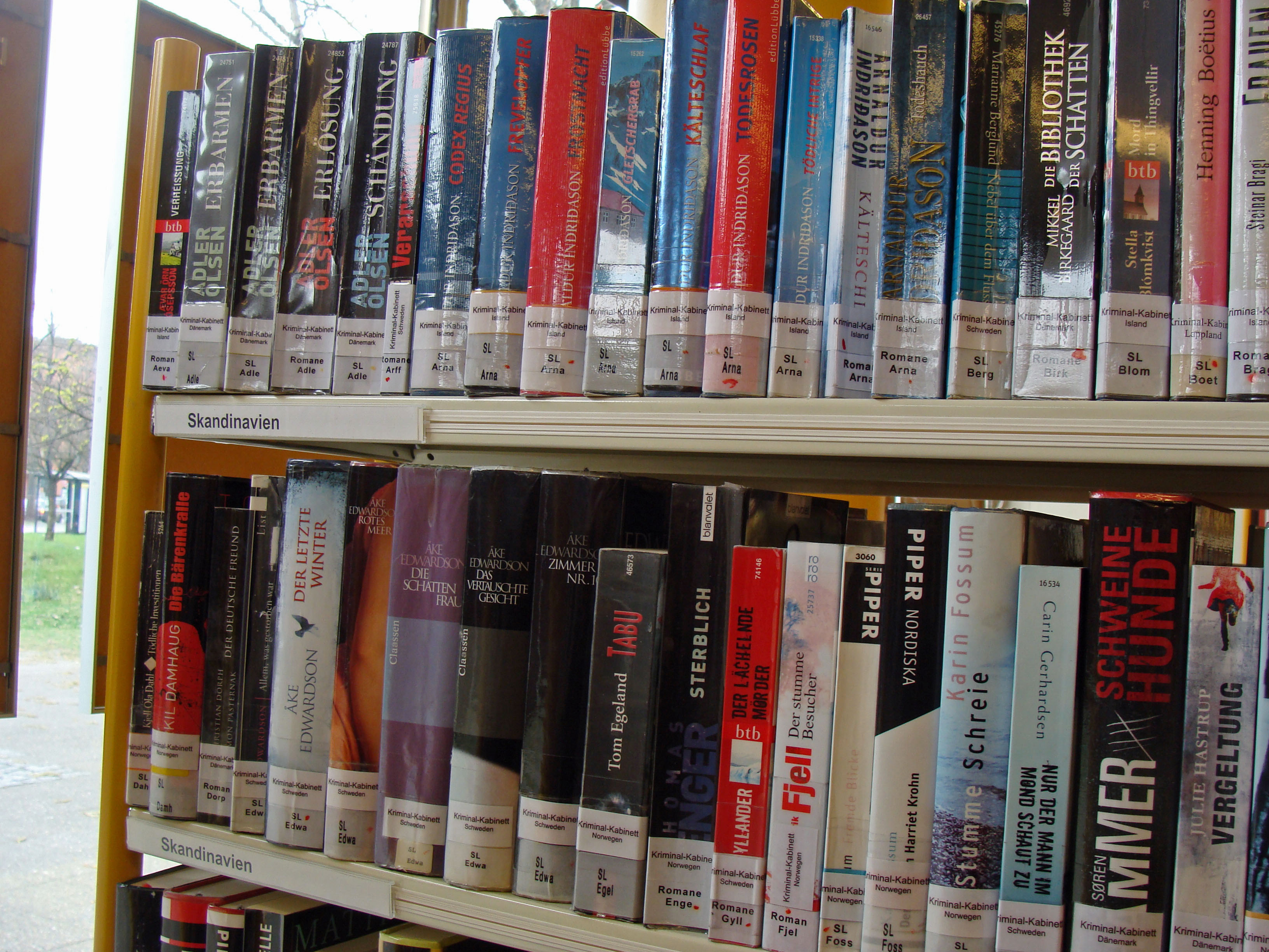 Skandinaviske kriminalromaner har stadig en høj stjerne i Tyskland, både Jussi Adler-Olsen, Sara Blædel, Leif G. W. Persson, Karin Fossum, Arne Dahl, Jo Nesbø, Arnaldur Indriðason var at finde i rigt mål på hylderne – bortset fra dem der var udlånt. Men også et større udvalg af finske krimier, end vi ser her i Damnark.